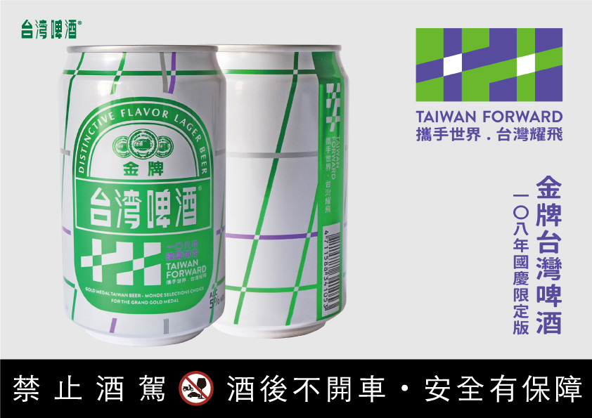 台酒表示,「金牌台灣啤酒一○八年國慶限定版」融合國慶的視覺設計,於罐身呈現鮮綠與紫色十字的交錯符號及「攜手世界、台灣耀飛」的108年國慶標語。而今年的設計更以大地綠象徵台灣人的積極與活力,並使用熱情紫展現台灣人好客的性格。此外,雙十符號也與往年不同,將過去並排相連的國字「十」,改為傾斜、分開的交錯配置,展現政府「攜手」向前的決心。