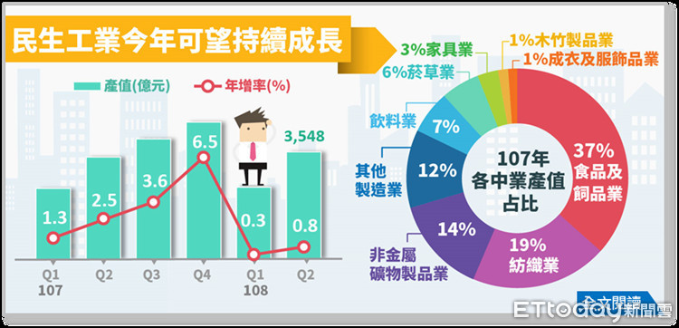 在內需市場持續穩定擴增下,今年前七月食品及飼品業產值達3,093億元,較上年同期成長2.89%,官員也預估在消費與投資需求成長帶動下,食品及非金屬礦物製品業等產值進一步提升,預估今年民生工業產值可望持續成長。