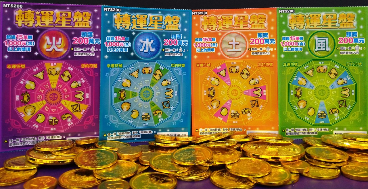 台灣彩券公司今(7)日推出以西洋星座4大星象為主題的新款刮刮樂「轉運星盤」,票面以「火」、「水」、「土」、「風」4大星象為主題,共有4款套票設計,每張售價200元,共有4個頭獎200萬元,總中獎率33.01%,讓民眾在防疫期間,也能刮出好運氣。