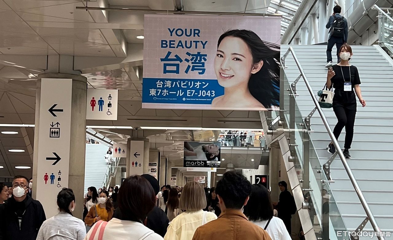 ▲台灣美粧館於大會走廊設置大型掛旗海報,吸引參觀買主蒞臨台灣館。(圖/貿協提供)