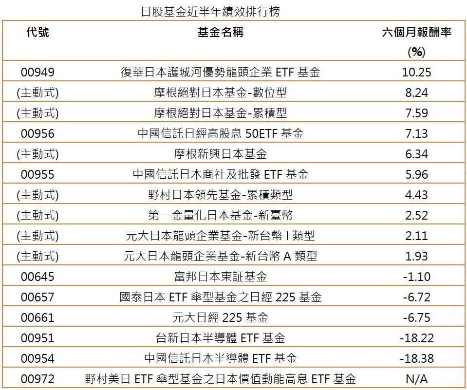 在基本面與資金面雙重利多下,日股表現穩健,帶動國內日股基金績效同步走揚,投信投顧公會資料顯示,近半年表現最佳者為復華日本龍頭(00949),報酬率達10.25%,穩居主被動型日股基金之冠;摩根絕對日本基金及中信日經高股息(00956)則以7%~8%的成績緊追其後。相較之下,傳統市值型或聚焦半導體題材的日股ETF,近半年多為負報酬,表現相對疲弱。