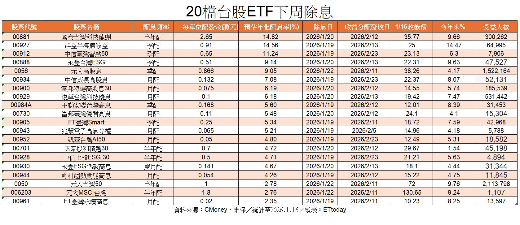新一波台股ETF除息秀當中,將由群益半導體收益(00927)、凱基台灣AI 50(00952)打頭陣,1月20日則由復華台灣科技優息(00929)、國泰台灣科技龍頭(00881)等多檔接力表現,擁有逾211萬受益人的元大台灣50(0050)則設定1月22日除息。