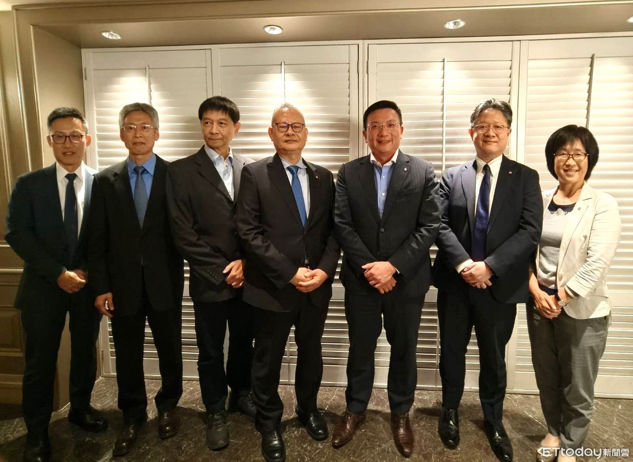 ▲左起即將升任總經理的陽明業務長李明輝、財務長蘇育文、技術長鄭正雄、總經理白崑榮、董事長蔡豐明、策略長吳宜達、行政長邱增玉。(圖/記者張佩芬攝)