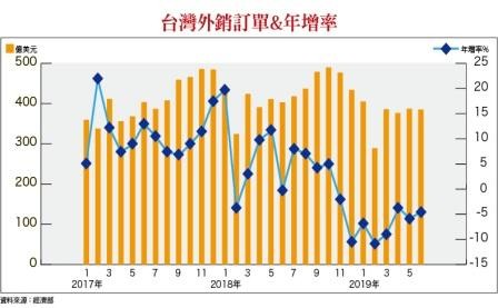 根據經濟部統計處新公布的六月外銷訂單統計,由於受貿易戰延燒影響,接單金額為三八五億美元,年減四.五%,已連續八個月年增率負成長;六月分除了資訊通信產品年增率達百分之四.七以外,其餘項目包括機械產品、化學品、基本金屬和塑橡膠製品,都受到國際原物料價格下滑,客戶又處於保守觀望的態度影響,接單較去年同期衰退。