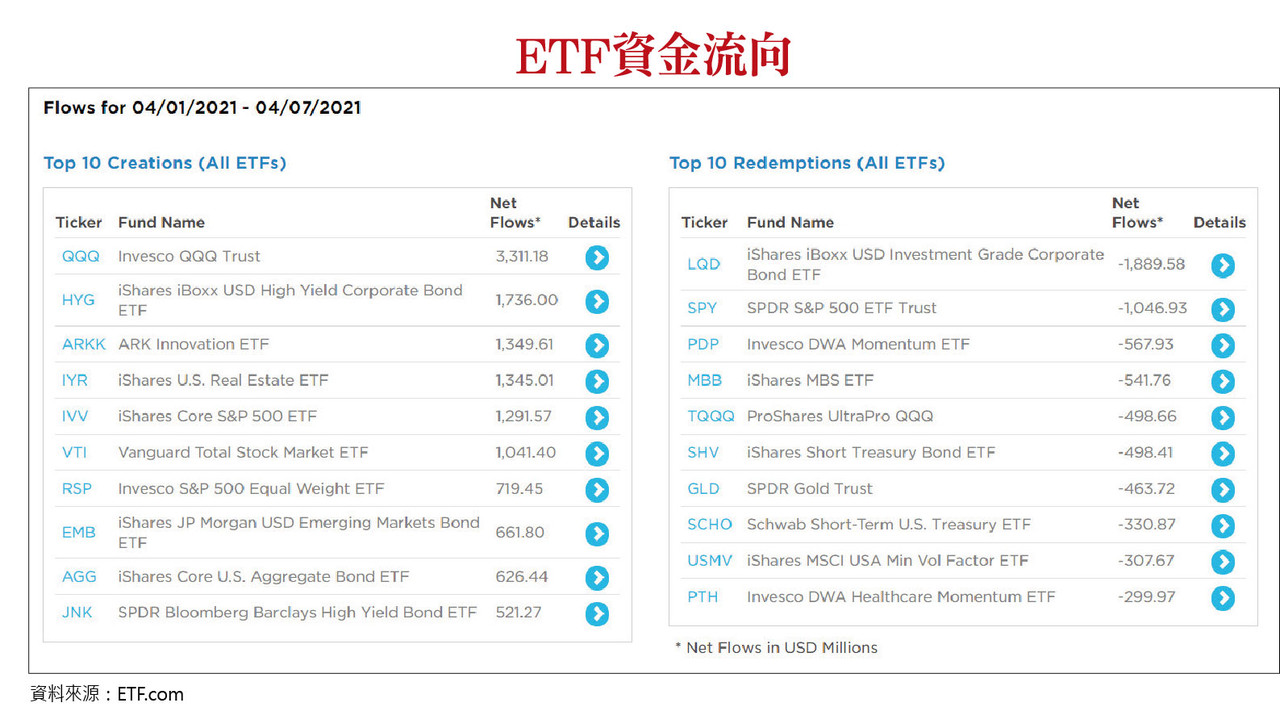 觀察ETF.com的ETF資金流向數據,可發現四月截至四月七日獲得資金淨流入榜首是追蹤那斯達克一百指數的QQQ,單周獲得33億美元的淨流入,顯示資金對因美國公債殖利率飆升導致評價修正及拜登提高企業稅最大受害者的科技股,原先的恐慌疑慮隨著美債殖利率自高點回弱而開始淡化。