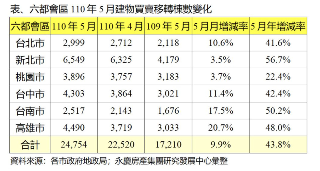 六都會區分別公布109年5月「建物買賣移轉棟數」,其中交易量最大為新北市6,549戶,六都交易量合計為24,754戶。永慶房屋研展中心副理陳金萍說明,5月份六都買賣移轉棟數月增9.9%,其中台北市月增10.6%,新北市月增3.5%,桃園市月增3.7%,台中市月增11.4%,台南市月增17.5%,高雄市月增20.7%。