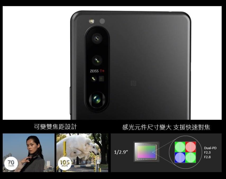 Sony Mobile表示,Xperia 1 III與Sony Alpha9系列的工程師,共同研發「全新三鏡頭相機與四組光學焦段」,提供16mm超廣角、24mm廣角以及70mm及105mm望遠鏡頭。以潛望式架構將70mm及105mm兩個焦段設計在同一顆鏡頭裡,開發出兼具高畫質及小體積的望遠鏡頭,在70mm至105mm焦段之間切換時,透過雙相素對焦也能持續精準追焦移動中的物體。Xperia 1 III同時攜手ZEISS蔡司光學打造專屬調校鏡頭,透過ZEISS T* 增透及抗反射塗層鍍膜,有效減少反射光線及提升對比,提供自然完美的色彩效果。