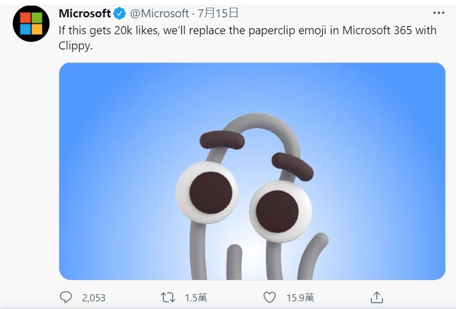 記得迴紋針小幫手嗎?他有可能可以重回大家的視野裡,微軟近期在推特上發布一則推文,表示只要獲得2萬讚,就讓迴紋針小幫手在Microsoft 365 生態圈「復活」,目前該則推文已經獲得15.9萬的按讚。