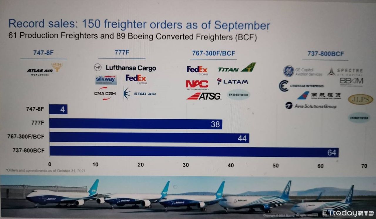 ▲波音今年接到最多貨機訂單,到9月底為止包括客改貨訂單共150架,。(圖/翻攝自波音簡報)