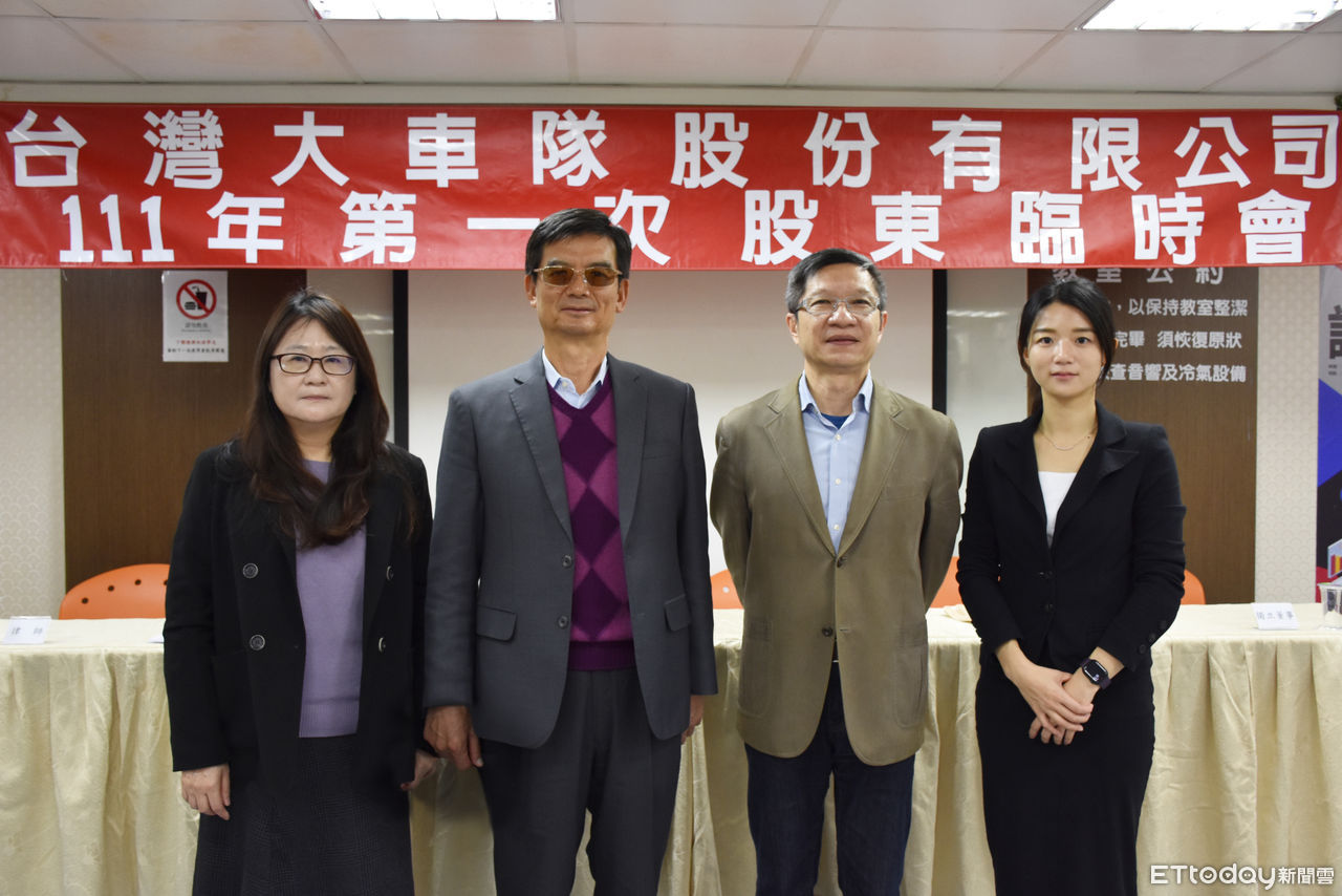 ▲左起台灣大車隊財務長楊雅玲、大車隊集團董事長林村田、集團總經理楊榮輝、大車隊執行長林念臻出席股東臨時會。(圖/大車隊提供)