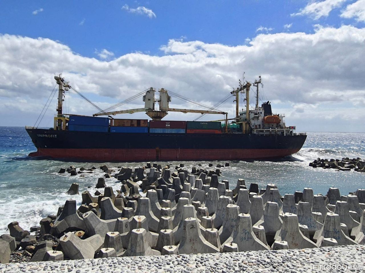 今(8)日上午9時40分,貝里斯籍「UNIPROFIT」貨輪因舵機故障,於臺東富岡漁港外海擱淺,船上11名大陸船員與5名印尼船員均安,計載有149只20呎貨櫃,皆為鋼材,船上殘油計399.5噸,包括重油328.7噸、柴油55.4噸、滑油15.4噸),船體無破損及無油污外洩情形,交通部航港局接獲通報後立即成立應變小組處理。