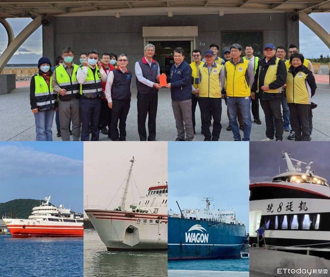 ▲交通部長王國材(前排右五)致贈加菜金嘉勉航港局及港務公司同仁疏運工作辛勞,由航港局局長葉協隆(前排左五)率副局長劉志鴻(前排左四)等接受;下圖為接受徵召參與疏運的四艘船(圖/航港局提供)