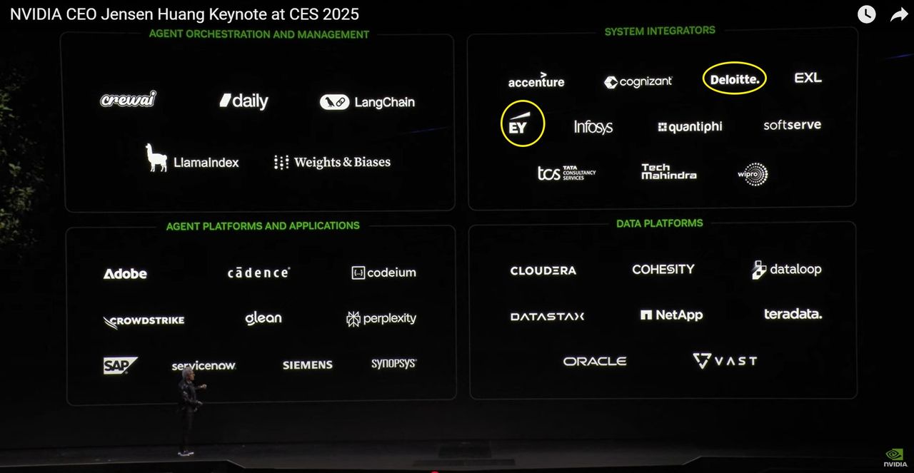 勤業、安永的國際性標誌在黃仁勳直播演講背板中出現,在「Agentic AI」(代理式人工智慧,代理式AI」環節中,與埃森哲(Accenture)、高知特(Cognizant)、EXL Service、SoftServe、印度塔塔諮詢、威普羅公司、 Infosys、Tech Mahindra、Quantiphi等,多為管理諮詢、數據應用領導業並列。