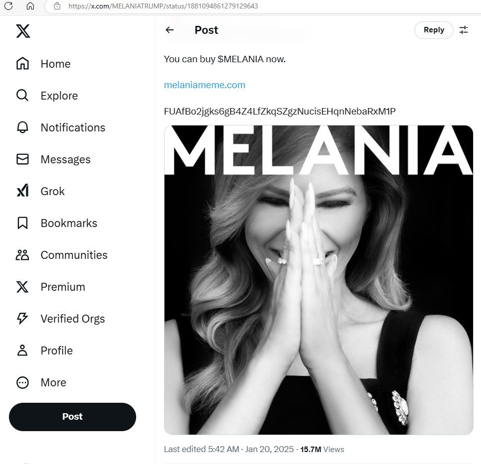 ▲▼川普妻子梅蘭妮亞在社群平台上宣布推出專屬迷因幣。(圖/翻攝X平台)
