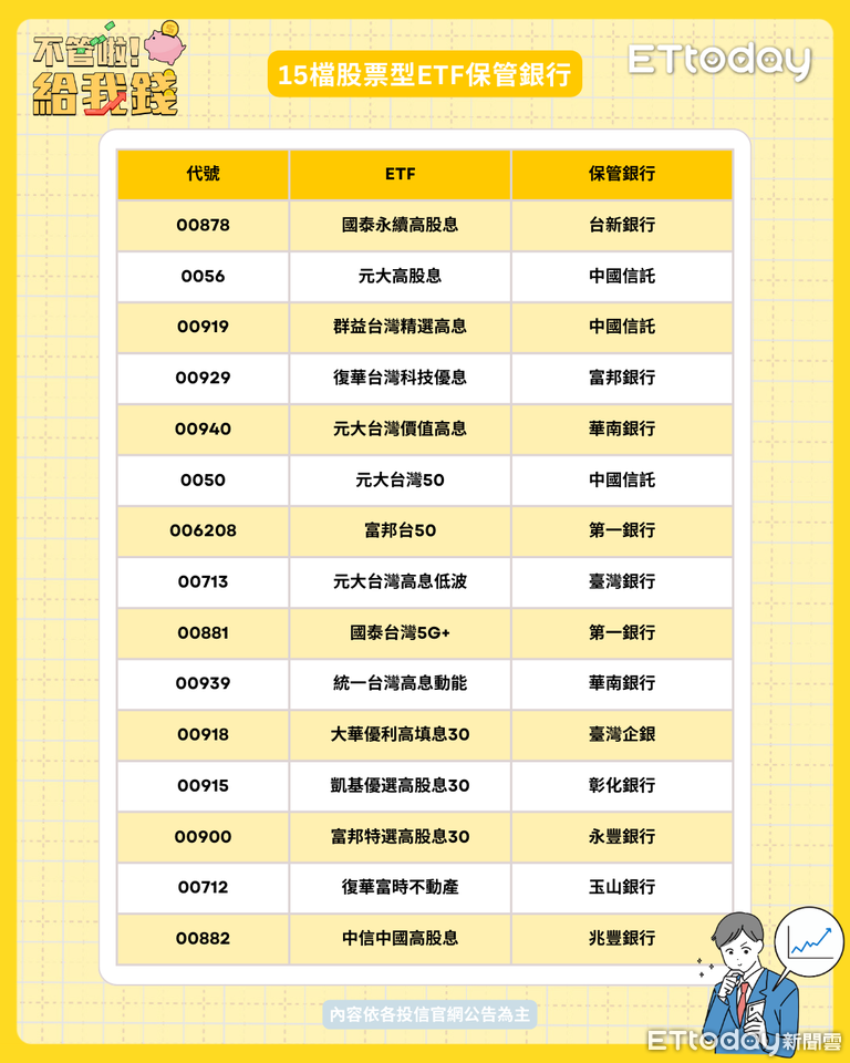 ▲15檔股票型ETF保管銀行(圖/不管啦!給我錢)