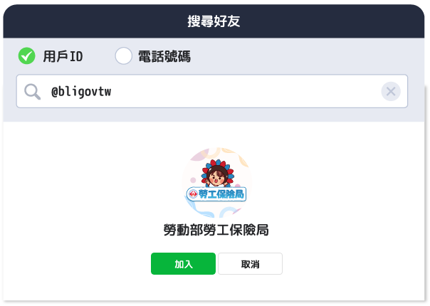 ▲民眾可透過搜尋「@bligovtw」並加入好友。(圖/取自勞動部勞工保險局)
