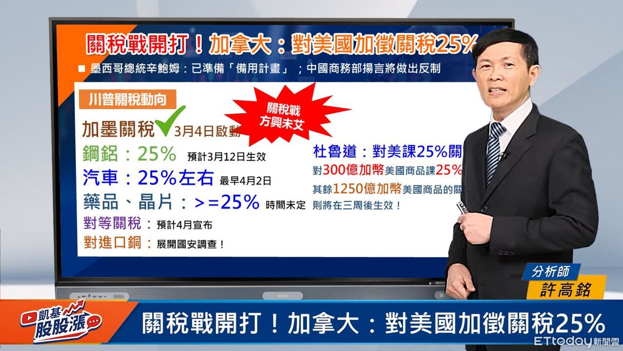川普關稅戰持續衝擊市場,美國對墨西哥與加拿大的25%關稅3/4實行,同時將中國關稅從10%提升至20%,引發全球股市重挫恐慌,而台積電(2330)在川普政策強烈要求下超乎預期宣布加碼一千億美元投資美國,更牽動台股及半導體類股劇烈震盪,台股僅一周時間便重挫1300點,導致台股投資人陷入恐慌,然凱基投顧建議投資人此時應逆向思考,於震盪區間下緣逢低承接。