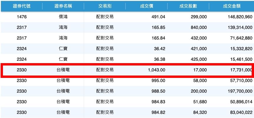 ▲台積電盤後鉅額交易。(圖/翻攝台灣證券交易所)