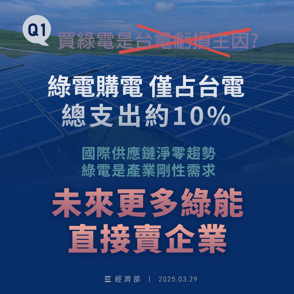 經濟部28日召開電價費率審議會,會中考量國際關稅變化與地緣政治風險,可能引發全球經濟與物價波動,決議暫緩調整電價。然而,台電連年虧損的原因仍引發社會熱議,經濟部對此於29日下午透過臉書澄清,強調台電虧損的主因在於「燃料成本高漲」,而非「購買綠電」。