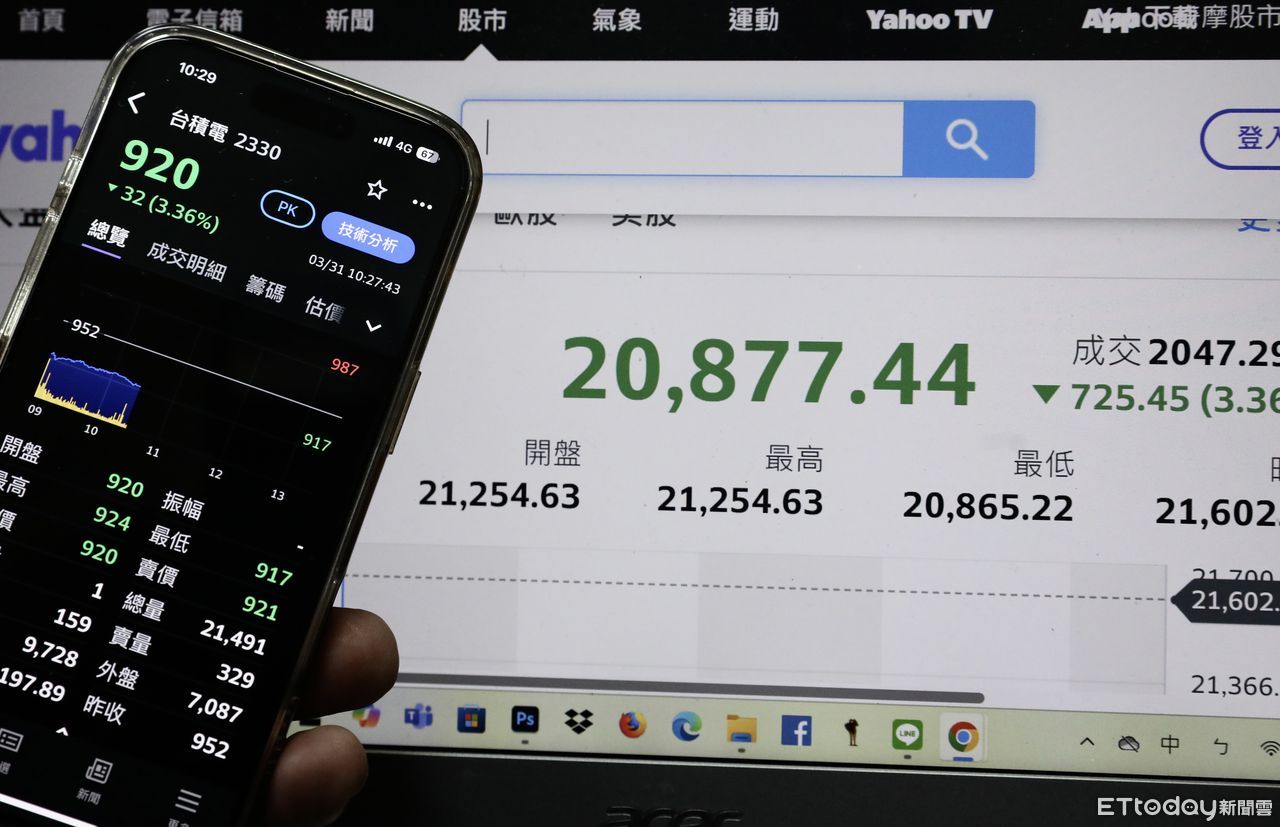 受到美國關稅戰影響,台股今日開盤不到5分鐘即失守21000點整數關卡,盤中最深跌逾800點為史上第5大,一舉踹破20900點、20800點兩大心理關卡,近午盤多頭企圖振作跌幅略為收斂,但在台積電(2330)跌逾3.5%、鴻海(2317)與聯發科(2454)盤中皆跌逾4%的壓力下,指數仍跌逾700點,多頭氣虛。