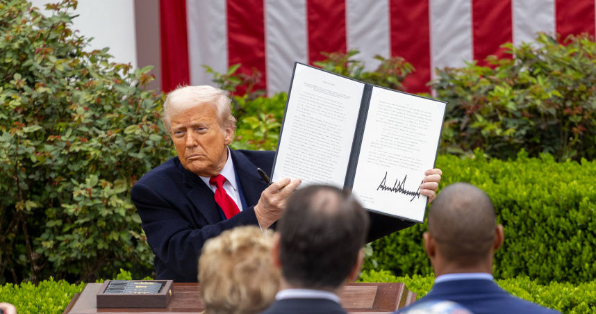 ▲美國總統川普4月2日在白宮前展示簽署的「對等關稅」行政令,引爆全球股市股災。(圖/CTWANT提供,下同)