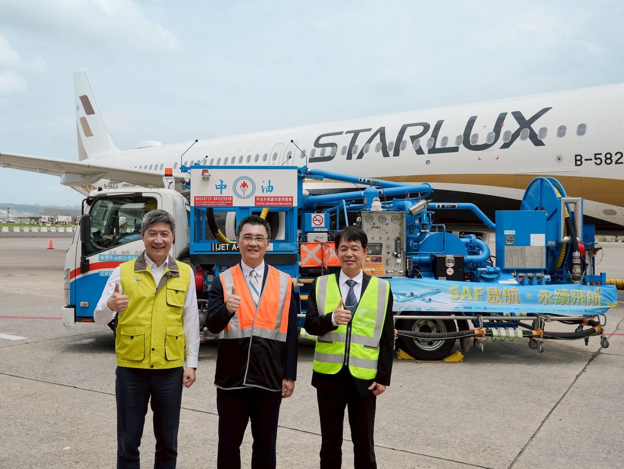 ▲星宇航空啟動永續航空燃油首航,圖左至右依序為桃園機場總經理范孝倫、星宇航空機場運務處副總李明杰、台灣中油執行長邱垂興。(圖/星宇航空提供)