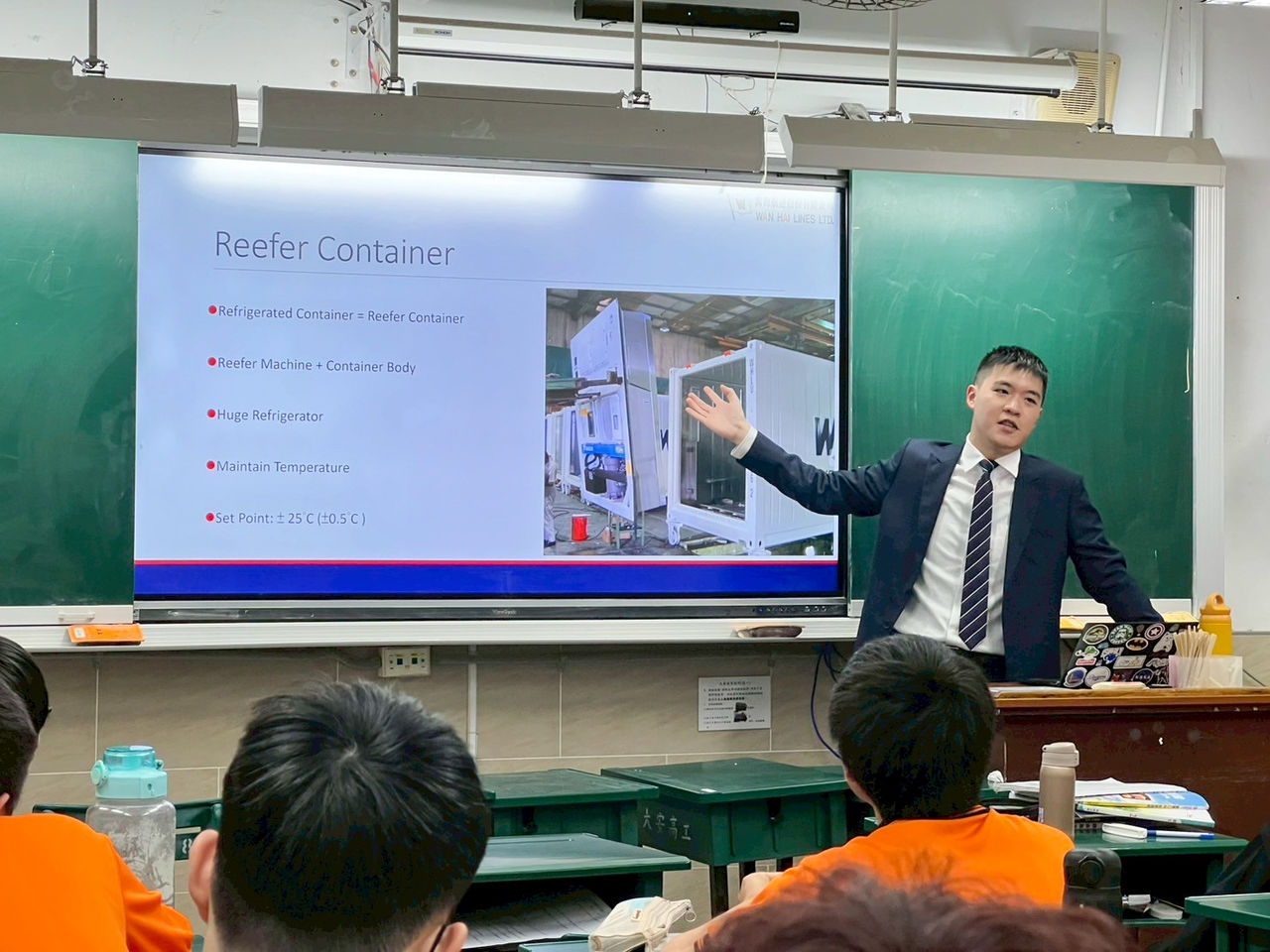 萬海陳誼名以全英文向現在場就讀冷凍空調科的大安高工近百名同學,以及透過鏡頭遠端向國際姊妹校數百名學生詳細說明海運冷凍貨櫃的原理、技術應用及未來發展趨勢。講座內容涵蓋了冷凍貨櫃的設計與運作、溫度控制技術、貨物保鮮方法以及全球冷鏈物流所面臨的挑戰。