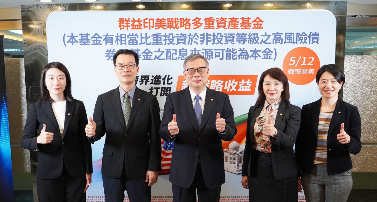 ▲ 群益印美戰略多重資產資金5/12開幕:(由左至右)群益印美戰略多重資產基金經理人向思穎、群益投信總經理陳明輝、群益投信董事長賴政昇、群益投信資深執行副總林慧玟、群益投信投資處副總張菁惠。(圖:公司提供)