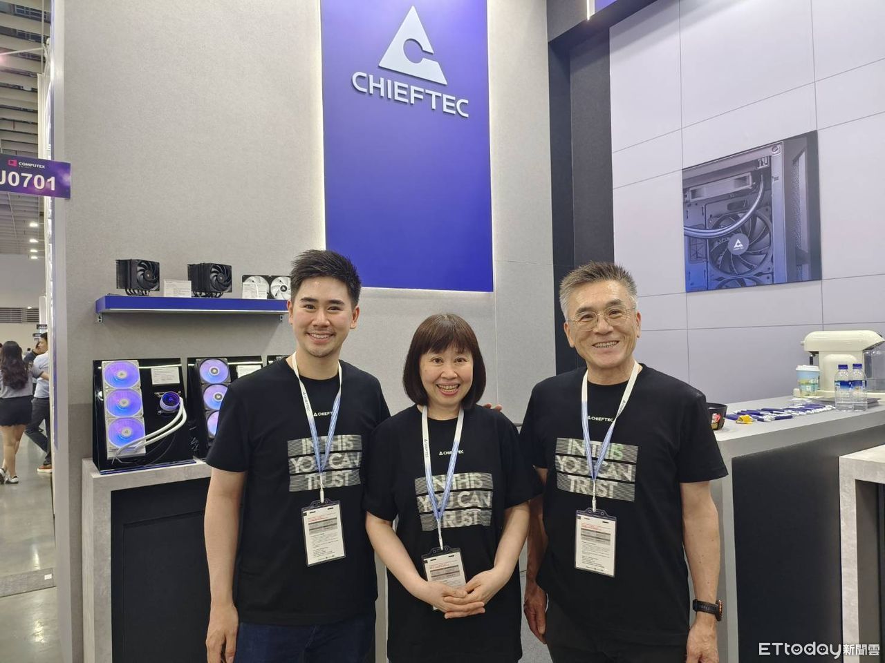 ▲右起誠廣國際負責人施學成、張雪姬、總經理施建全在台北國際電腦展公司展區內合影。(圖/記者張佩芬攝)