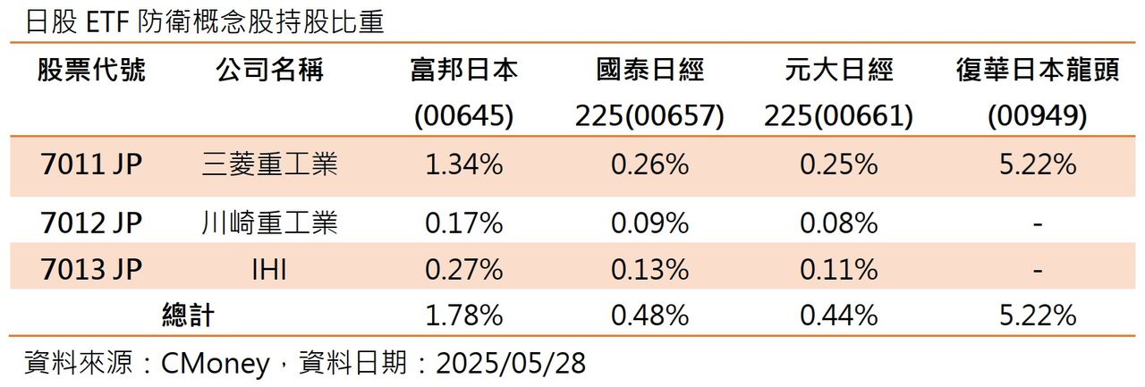 資金明顯聚焦防衛主題,國內投資人可透過日股ETF掌握日本國防產業商機。台灣上市的日股ETF中,共有四檔涵蓋重工三雄,包括富邦日本(00645)、國泰日經225(00657)、元大日經225(00661)及復華日本龍頭(00949)。