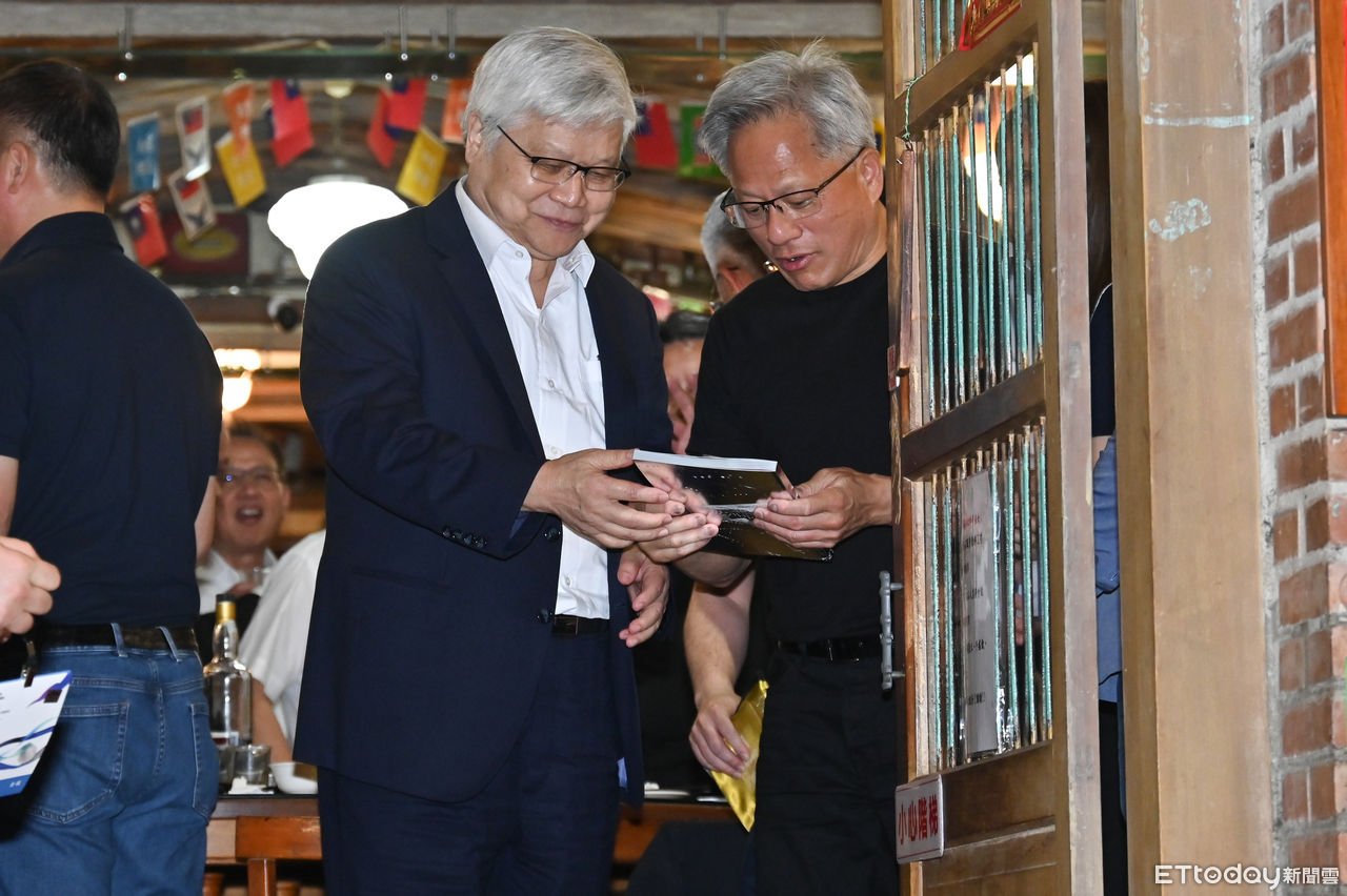 ▲輝達執行長黃仁勳上月宴請供應鏈廠商,台積電董事長魏哲家(左)也與會。(圖/記者李毓康攝)
