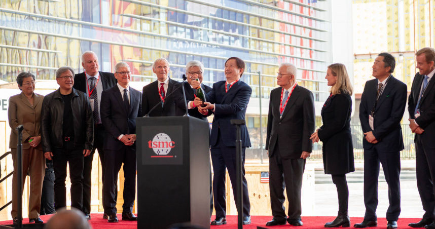 ▲2022年台積電亞利桑那州12吋晶圓廠移機典禮,劉德音、魏哲家、張忠謀、庫克、黃仁勳、蘇姿丰等科技巨頭共同見證。而中鼎則是該廠的工程和建築承包商。(圖/台積電提供)
