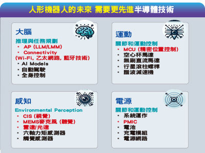 有別於過去聚焦雲端運算和虛擬應用,「實體AI」代表AI從虛擬跨入物理世界,讓機器人具備感知、理解和操作真實環境的能力,從視覺、語音處理到觸覺回饋,每個環節都需要高度客製化的半導體解決方案。在今年北美技術論壇,台積電首次將人形機器人列為發展焦點,詳列從「大腦」到「四肢」的各部件需求,包括AP處理器、影像感測器(CIS)、微機電麥克風(MEMS)、關節控制MCU、動力層PMIC等。為讓機器人在複雜環境中即時反應並長時間運作,降低能耗與提升運算能力成為關鍵挑戰,需要更先進半導體支持。