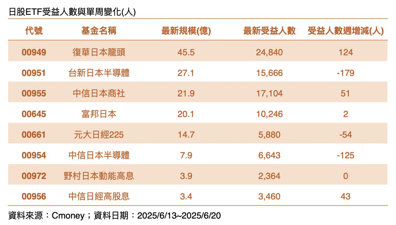 上週受以色列空襲伊朗影響,日本股市表現承壓,不過仍有投資人逢低進場。CMoney 統計(截至6月20日),台灣掛牌日股ETF中,復華日本龍頭(00949)受益人數上週逆勢增加124人,為全日股ETF之最,最新受益人數突破2.4萬人,規模達45.5億元,穩居日股ETF龍頭。其餘如中信日本商社(00955)、中信日經高股息(00956)與富邦日本(00645)受益人數亦呈現增加態勢。