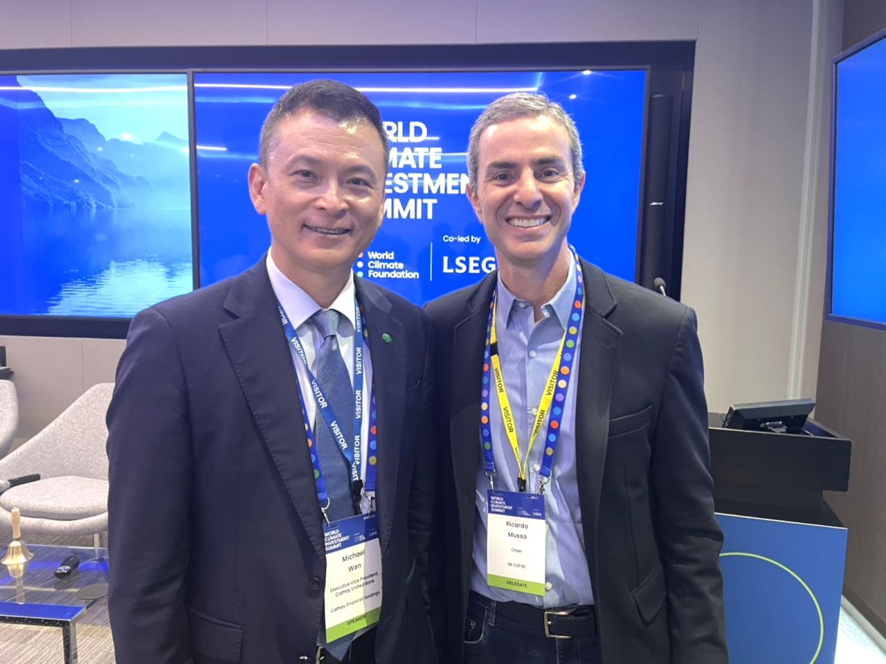 ▲國泰世華銀行副總經理温珍瀚(左)在氣候投資高峰論壇中,與今年11月將參加巴西貝倫聯合國氣候峰會(COP 30)的永續企業倡議聯盟Sustainable Business COP主席Ricardo Mussa(右)合影。國泰金控也將於今年五度挺進COP,為這場全球盛會注入台灣觀點。(圖/國泰金控提供)