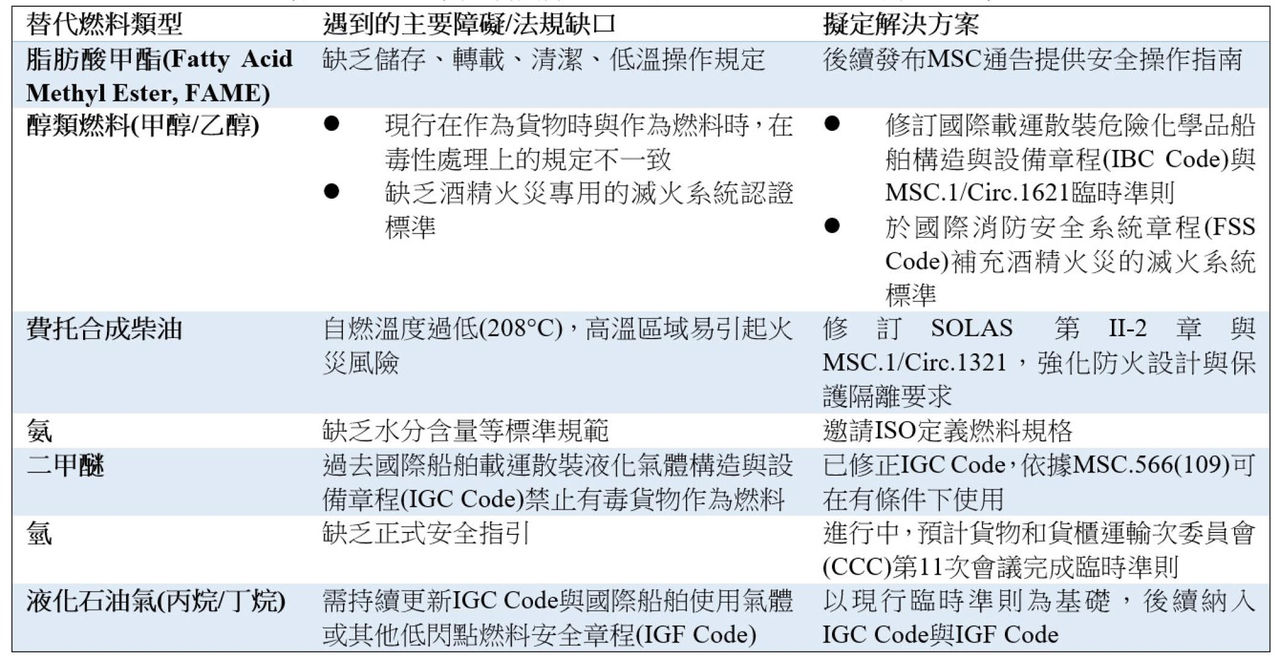 ▲不同替代燃料其障礙與法規缺口及目前擬定的解決方案。(圖/CR提供)