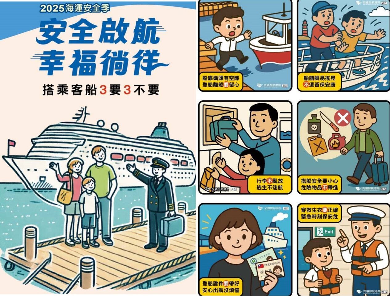 為提升航運業者與民眾航行安全意識,航港局以客船、遊艇、浮具三大主題為主軸,於7月1日正式啟動「2025年海運安全季宣導活動」。首月活動以客船為主軸,提醒民眾搭乘客船務必要注意6大安全事項,多一分準備,少一分風險,希望民眾都能「開船搭船多注意,快樂平安出航去」。