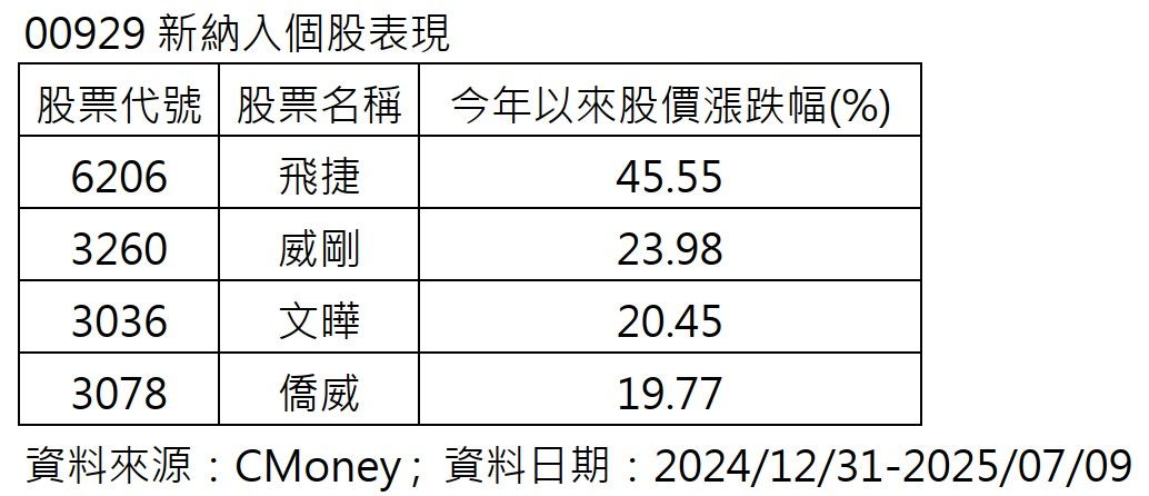 因應市場環境變化,00929於今年6月調整成分股,納入AI與半導體題材潛力股,包括華碩(2357)、仁寶(2324)、飛捷(6206)、威剛(3260)、文曄(3036)與僑威(3078)等,緊扣全球科技趨勢。