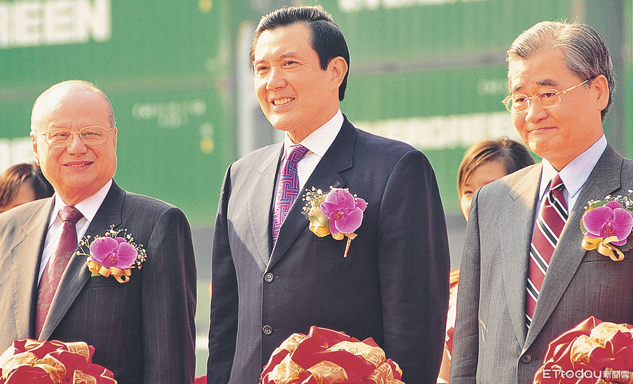 ▲2008年12月15日長榮海運立敏輪兩岸直航首航典禮上,總統馬英九(中)、交通部長毛治國(右)與林省三(左)合影。(圖/時報出版提供)