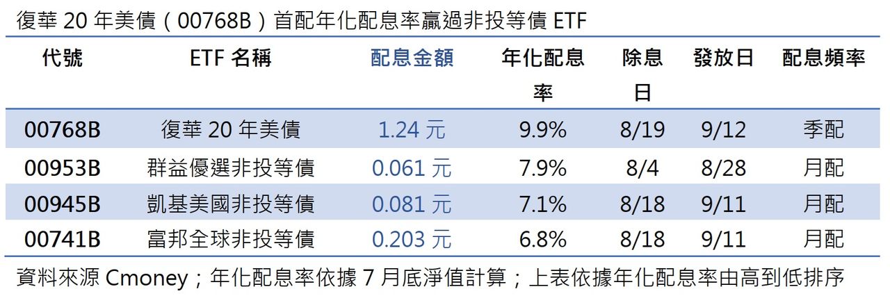 8月債券ETF除息秀熱鬧登場,首度配息就震撼市場的復華20年美債(00768B)一舉成為市場焦點。首季配息每單位高達1.24元,年化配息率達9.9%,不僅刷新美債ETF紀錄,更罕見超越多檔非投資等級債ETF,成為本月最受矚目的除息新星。