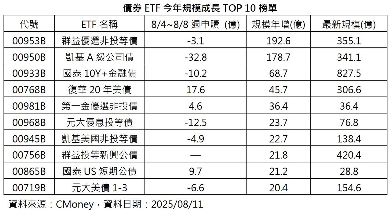 觀察今年原型債券ETF規模變化,高達69檔出現縮水,部分甚至衰退逾百億元、甚或超過500億元。不過,仍有25檔逆勢成長,其中2檔規模增加逾百億元,分別為群益優選非投等債(00953B)的192.6億元,以及凱基A級公司債(00950B)的178.7億元;第三名則為國泰10Y+金融債(00933B),規模增加68.7億元。
