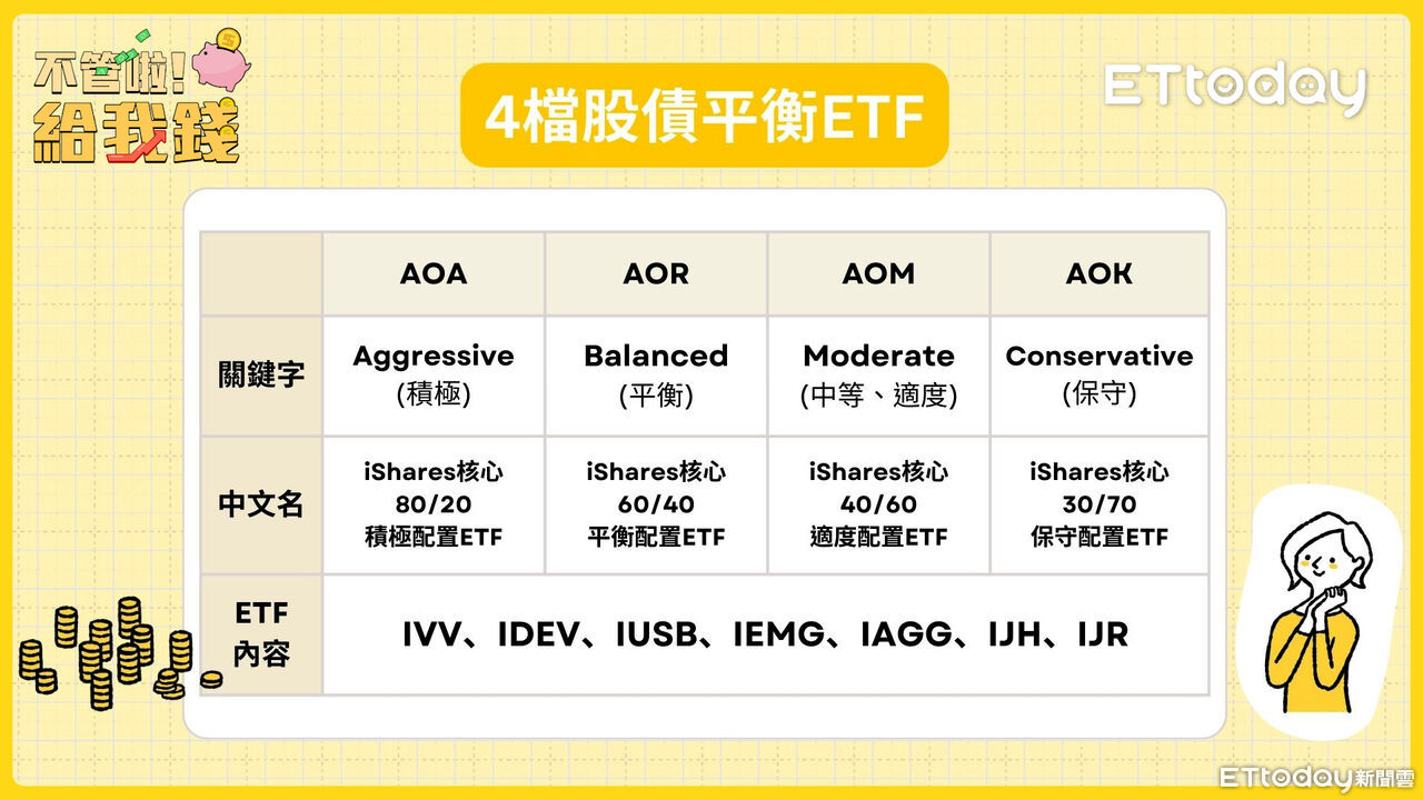 ▲美國 iShares於2008年推出四檔股債平衡ETF,分別為AOA、AOR、AOM與AOK。(圖/翻攝自《不管啦!給我錢》)