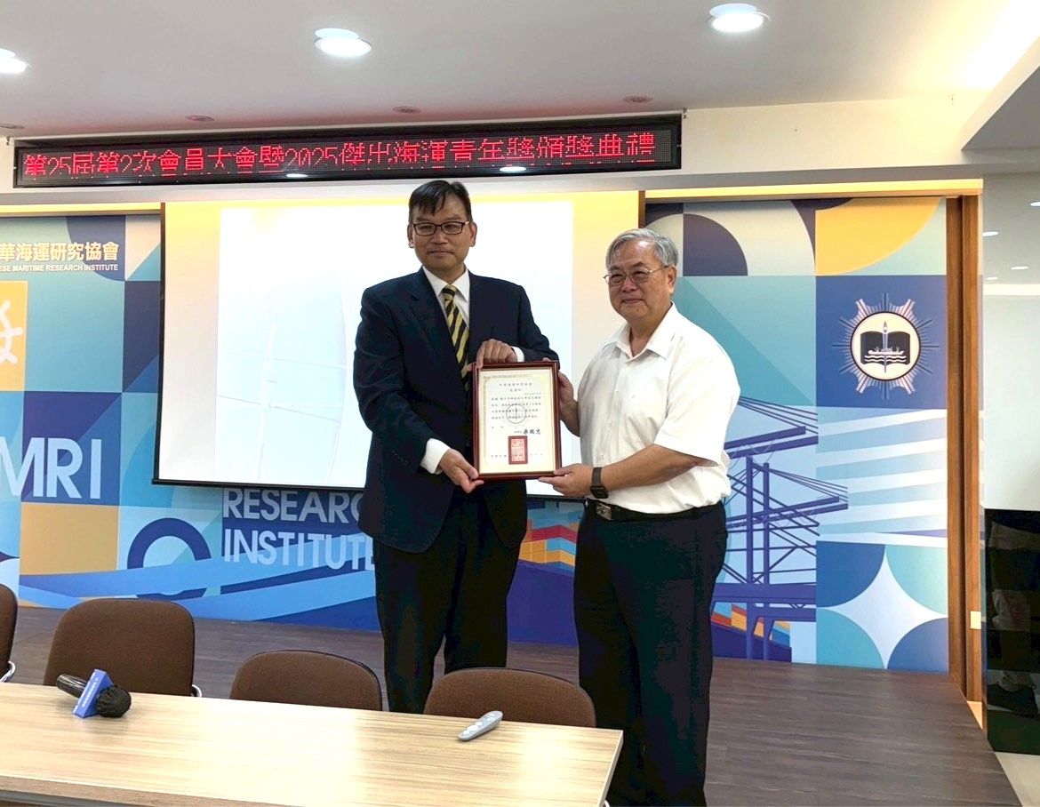 ▲中華海運研究協會理事長桑國忠(左) 致贈感謝狀給高雄科技大學副校長俞克維(右)。(圖/海研會提供)