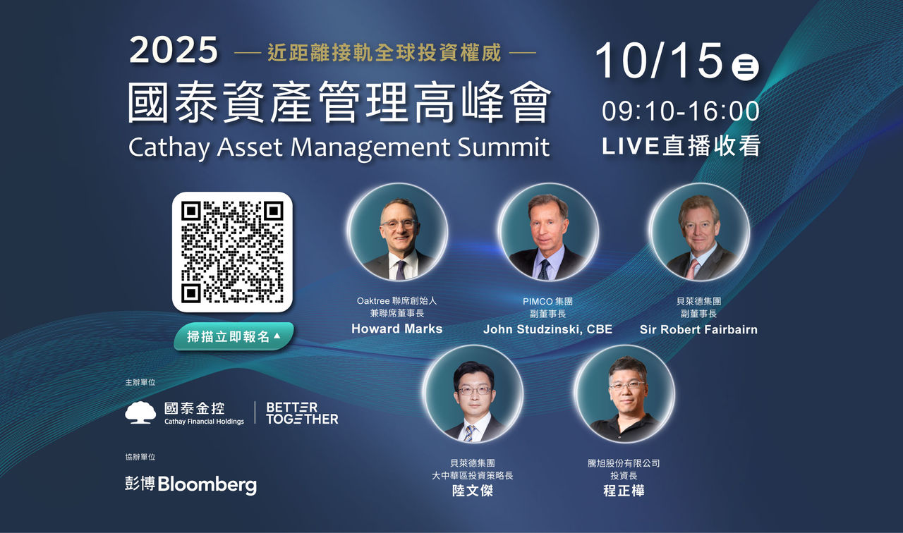第二屆「國泰資產管理高峰會」不僅已成為國際投資權威對話與交流平台,更是助力台灣投資人在國際政經局勢變動下,掌握市場先機的年度投資盛會。本場峰會將於10月15日(周三)於台北萬豪酒店登場,同步提供線上直播,並於即日起開放報名。詳細議程及國際專家陣容名單詳見網站:https://cathayholdings.info/47zDEil