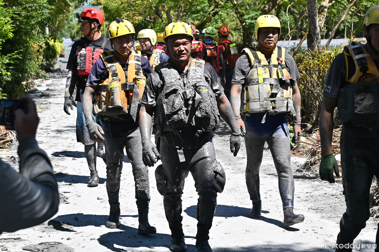 ▲強颱「樺加沙」外圍環流帶來可觀雨量,導致花蓮馬太鞍溪堰塞湖溢流,洪峰沖毀馬太鞍溪橋,大水漫入光復鄉市區,鄰近堤防的佛祖街災情慘重,今日水勢稍退但仍有厚重淤泥堆積,搜救人員不顧渾身泥濘持續在該地搜索。(圖/記者李毓康攝)