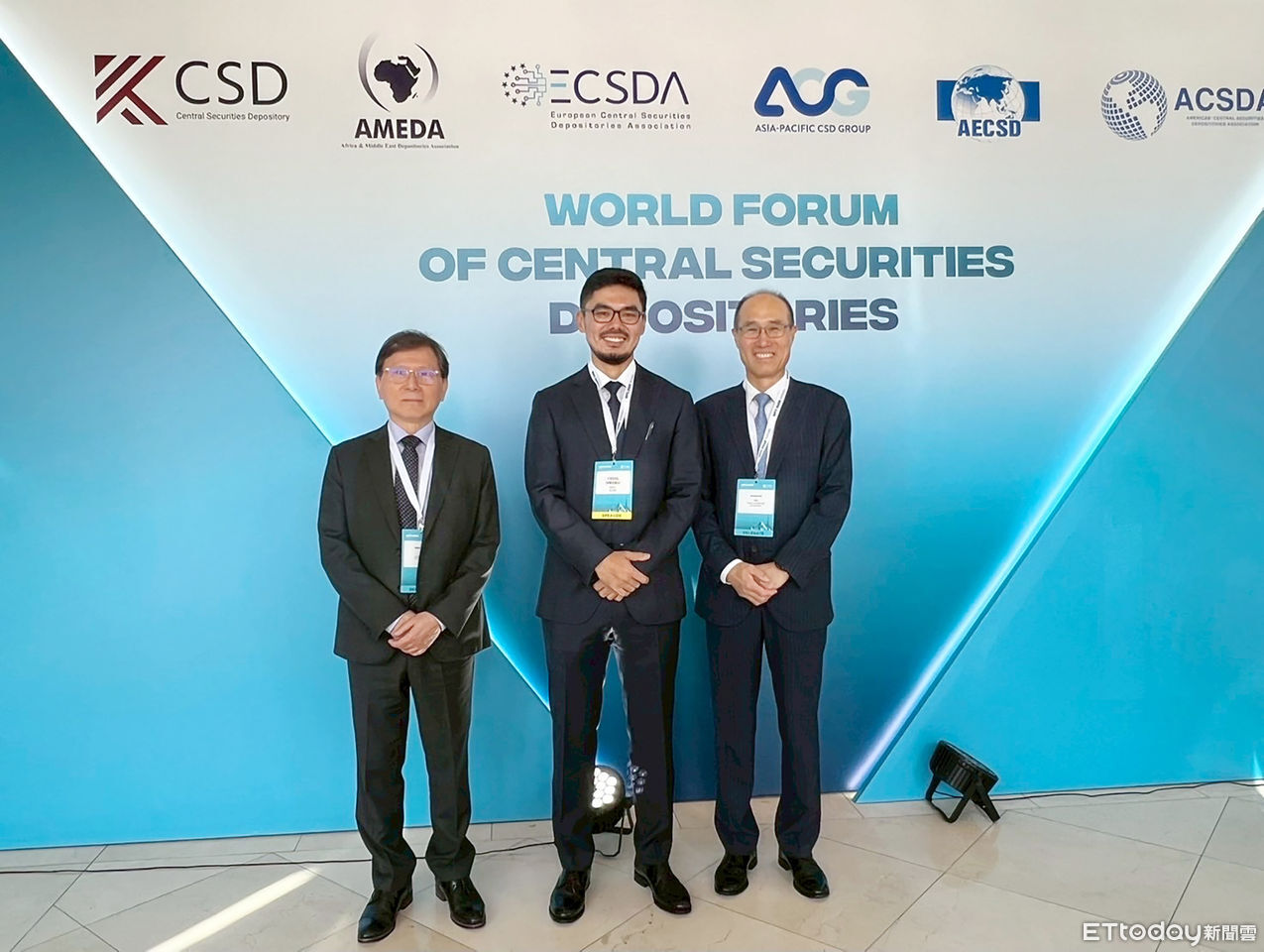 ▲集保結算所董事長林丙輝(左)出席2025年WFC會議,與WFC主席Yedil Medeu(中)及韓國集保公司董事長Soonho Lee合影。(圖/集保結算所提供)