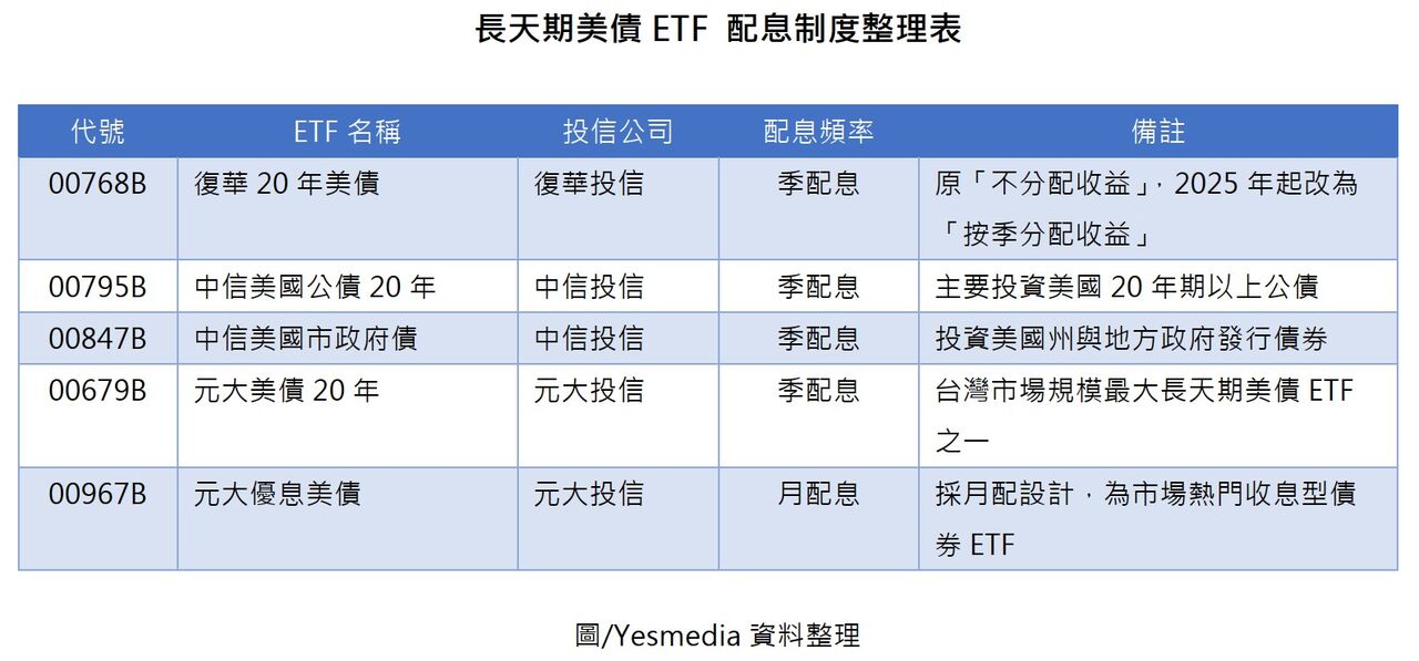 對長期關注債券ETF的投資人來說,今年最受矚目的變化之一,就是復華20年美債ETF(00768B)終於改變了「六年不配息」的模式,正式加入「季配息」行列。根據復華投信公告,主管機關已核准00768B的收益分配方式由「不分配收益」改為「按季分配收益」,並自2025年起實施。這項改變,也讓00768B成為市場上少數兼具長天期配置+季季配息的美債ETF。根據公告資料,首度配息金額為每單位 1.24 元,年化約 9.98% 至 10% 左右。復華投信表示,該制度的目的在於提供投資人更穩定的現金流,特別是對於定期定額族群與退休族而言,季配息有助於資金安排。不過,配息金額與頻率並非固定或保證,實際配息仍依市場利率、基金收益與資產變化而定。
