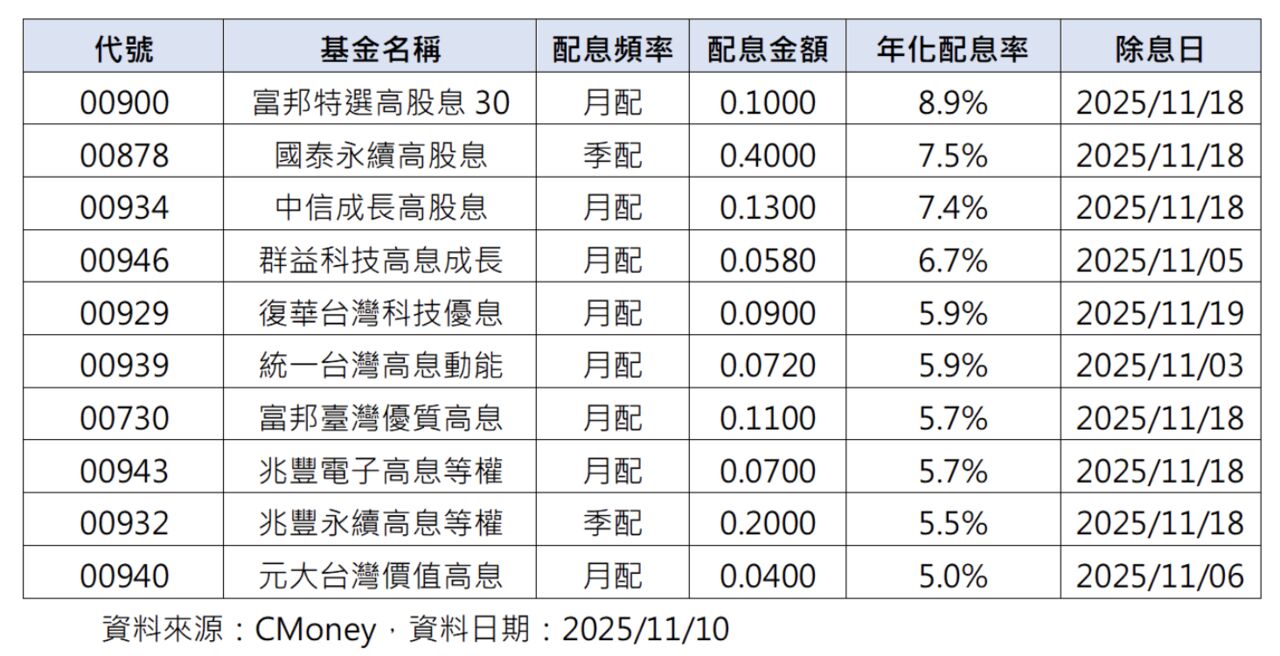 本月共有16檔高股息ETF參與除息,時間集中在11月17日至19日。整體來看,有10檔年化配息率突破5%,其中富邦特選高股息30(00900)以8.9%坐穩本月冠軍,國泰永續高股息(00878)及中信成長高股息(00934)緊追在後,年化配息率皆超過7%。