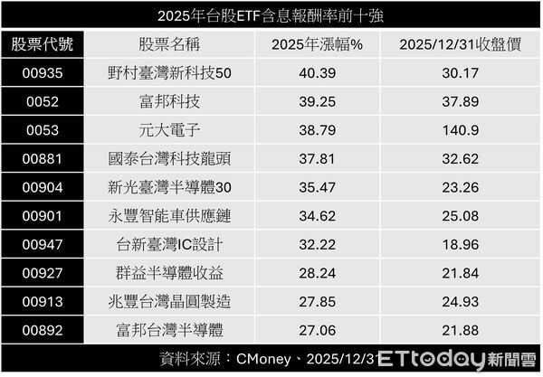 台股2025年風光收盤,全年大漲5928.5點、漲幅達25.74%,其中AI潮流引領下半年台股頻創新高,統計2025年台股科技ETF前十表現,含息報酬率落在3成上下,排名居冠野村台灣新科技50(00935)拿下。