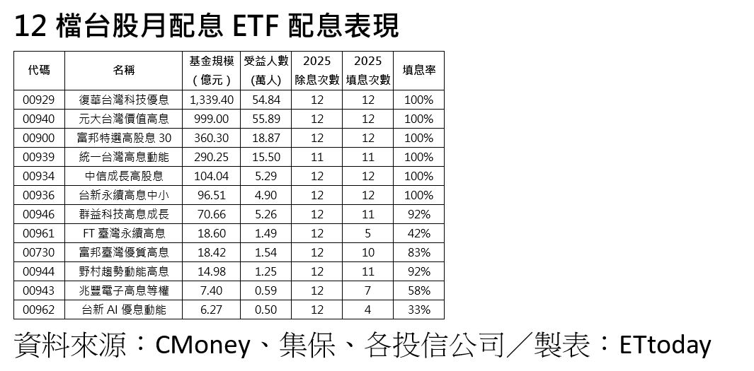 台股頻創新高,「月月配」ETF規模榜洗牌,《ETtoday》統計有6檔去年填息率達100%,順利達陣的標的多以聚焦高息電子及中小型股主題,其中復華台灣科技優息(00929)規模回升至1339.4億表現居冠,而元大台灣價值高息(00940)除息秀失利,本周規模失守千億元大關,兩檔表現南轅北轍成為話題。